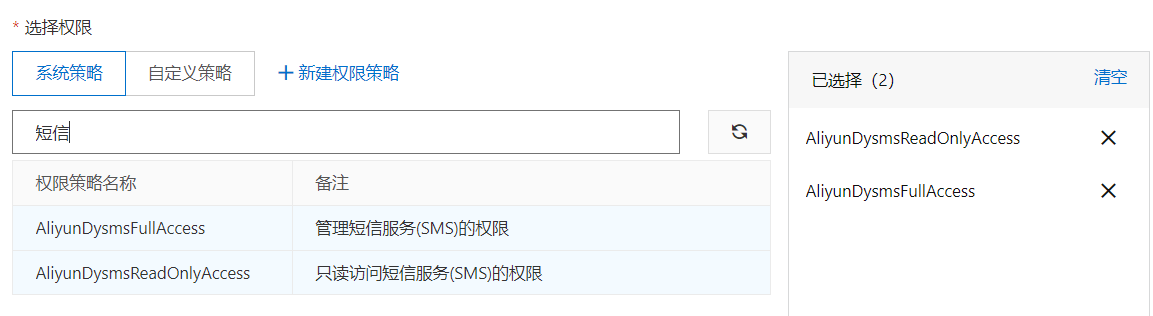 4.选择权限,如图:搜索 短信,把出现的两个API分别点击添加到右侧,最后点击确定: