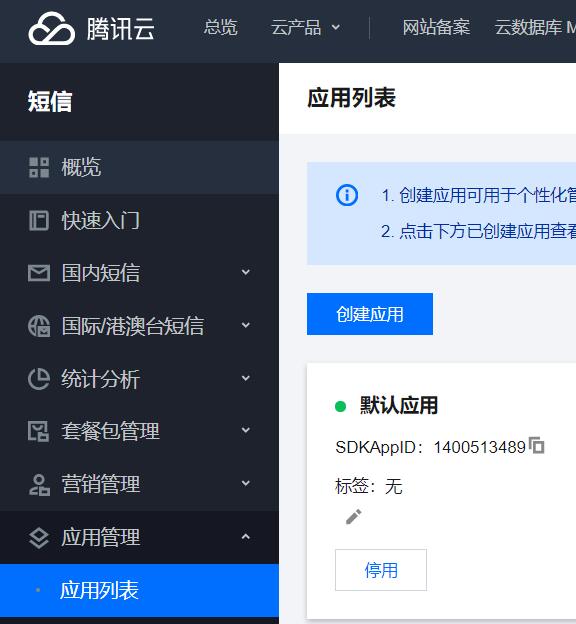 1. 登录腾讯云后,点击这里进入短信后台,然后点击【创建应用】,按提示完成操作。